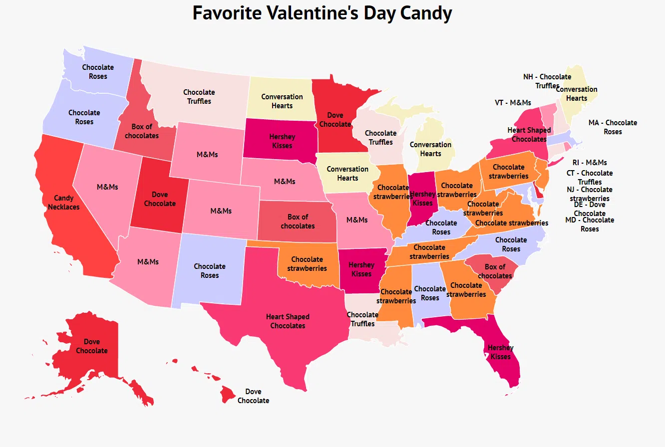 8. California is the only state where “candy necklaces” are first . . . New York and Texas love “heart-shaped chocolates” . . . and a “box of chocolates” is #1 in Idaho, Kansas, and South Carolina.